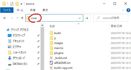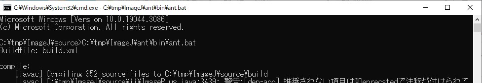 C:\tmp\ImageJ\source> C:\tmp\ImageJ\ant\bin\ant.batコマンドプロンプトの起動は、エクスプローラで「C:\tmp\ImageJ\source」フォルダを開き、アドレス欄にcmdと入れて起動するのが簡単です。