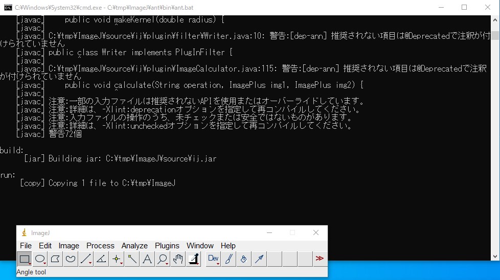 正常にビルドできれば、改変したImageJが起動します。私の環境では警告がいっぱい表示されましたが、全て「@Deprecatedで注釈が付けられていません」でした。