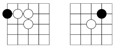 To jump, the ball must be adjacent to one or more white stones. It is moved in a horizontal, vertical, or diagonal to the first vacant intersection beyond one or a sequence of white stones, the jumped white stones are then removed. If a jump is performed, the same player may continue jumping as long as the ball continues to be adjacent to at least one white stone, or may end the turn at any point. Jumping is not obligatory.