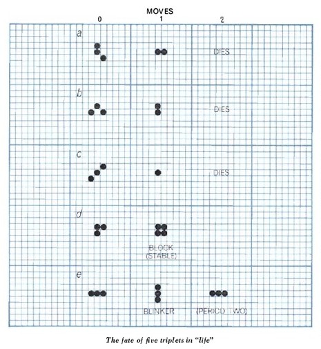 - Any dead cell with three live neighbours becomes a live cell, as if by reproduction.