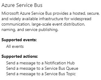 Here's an example of **Azure Service Bus** and the different locations events can be sent to such as **Notification Hub, Queues and Topics**. Each event type such as sending failed events can be sent to queues and topics allowing for integrations between external systems.