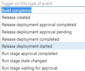 Release events are also available, allowing teams to track when a deployment starts and when each deployment stage state has changed. In a following article, we will discuss the importance of deployment stages can be for collaboration across multiple teams during a deployment. Below is an example of the "***Release deployment started***" trigger.
