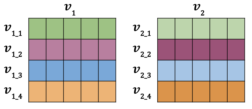 "The data is setup so that $v_{1\\_1}$ and $v_{2\\_1}$ represent duplicate inputs, but they are not duplicates with any other rows in the batch. This means $v_{1\\_1}$ and $v_{2\\_1}$ (green and green) have more similar vectors than say $v_{1\\_1}$ and $v_{2\\_2}$ (green and magenta).\n",