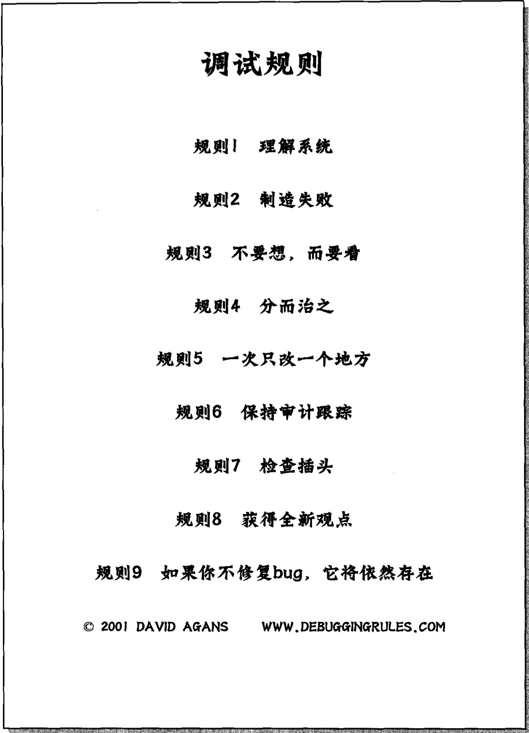 下图是《调试九法:软硬件错误的排查之道》一书提及的九大调试规则。