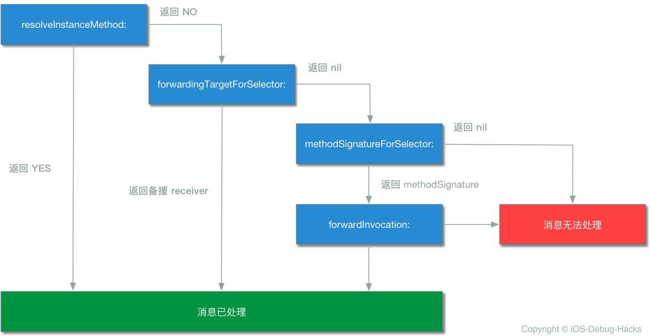 `methodSignatureForSelector` 拿到方法签名,然后使用前面获取到的方法签名对象和 `frameStackPointer` 实例化 `invocation` 对象,调用 `receiver` 的 `forwardInvocation:` 方法,并将刚才实例化的 `invocation` 对象传入。最后如果没有实现 `methodSignatureForSelector` 方法并且 `selector` 已经在 Runtime 注册过了,则调用 `doesNotRecognizeSelector:` 以抛出异常。