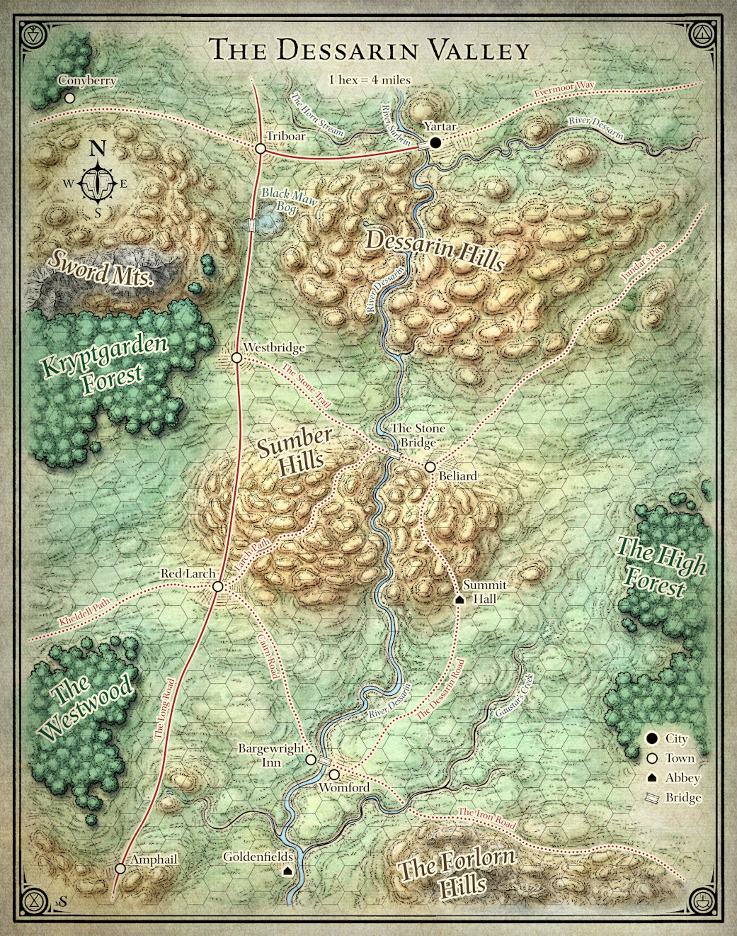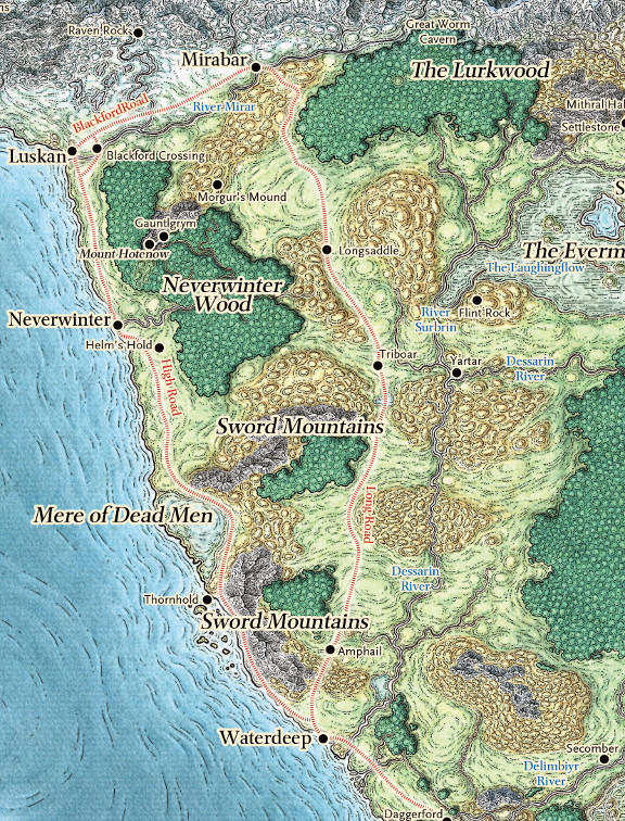 The party makes their way down The Stone Trail. After a day of travelling they decide to set up camp at the foot of the Sumber Hills near River Dessarin. They spot fire raining down from the sky deeper into the Sumber Hills and want to investigate.