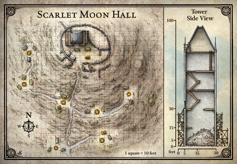After a few hours of trekking across the Dessarin Valley grassland and into the Sumber Hills, the party finds a burnt out tower on the top of a hill. A single sentry patrols up and down the main path leading to the Scarlet Moon Hall. They dazzle and dispatch of the fire elemental sentry with ease.