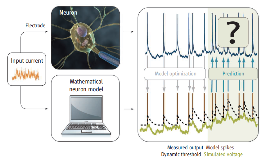 { "metadata": { "name": "slides" }, "nbformat": 3, "nbformat_minor": 0, "worksheets": [ { "cells": [ { "cell_type": "markdown", "metadata": { "slideshow": { "slide_type": "slide" } }, "source": [ "Brian Model Fitting Tutorial\n", "============================\n", "### CNS 2013\n", "#### Cyrille Rossant" ] }, { "cell_type": "markdown", "metadata": { "slideshow": { "slide_type": "slide" } }, "source": [ "## Spiking neuron models can accurately reproduce the response to a somatically injected current\n", "\n", "" ] }, { "cell_type": "markdown", "metadata": { "slideshow": { "slide_type": "slide" } }, "source": [ "## How to estimate the parameters?\n", "\n", " * Model-specific optimization algorithms\n", " * Generic optimization with Brian" ] }, { "cell_type": "markdown", "metadata": { "slideshow": { "slide_type": "slide" } }, "source": [ "## The BRIAN model fitting toolbox\n", "\n", " * Give the equations in mathematical form as usual\n", " * Specify the parameters to optimize\n", " * Specify the injected current and the output spikes\n", " * Run the procedure and get the optimized parameters\n", " \n", "