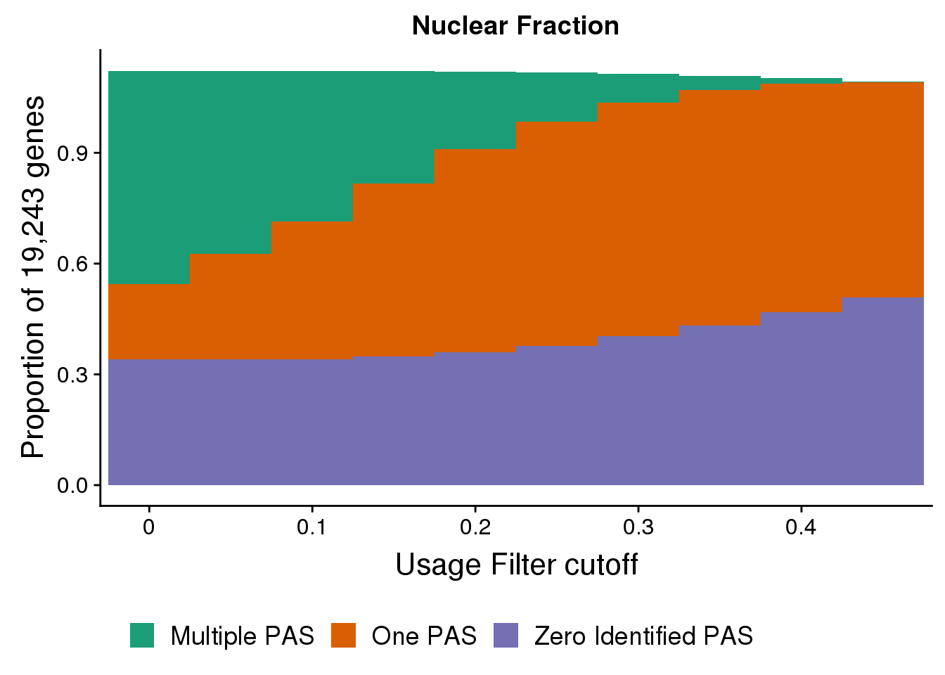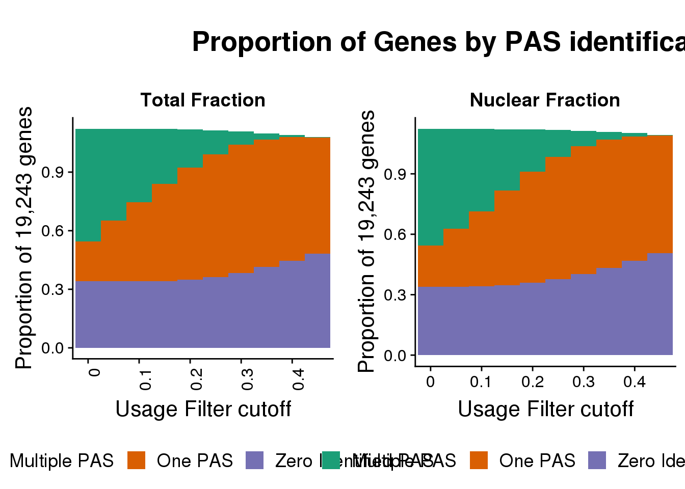 nuclearPropgenes=ggplot(FullDFNuc_melt,aes(x=Cutoff, y=propGene, by=Category, fill=Category)) + geom_bar( width=1,stat="identity") + labs(title="Nuclear Fraction",y="Proportion of 19,243 genes", x="Usage Filter cutoff") + scale_x_discrete(name="Usage Filter cutoff", breaks=c("0","0.1","0.2", "0.3", "0.4","0.5")) + theme(text = element_text(size=16), legend.position = "bottom")+ scale_fill_brewer(name = "", labels = c("Multiple PAS", "One PAS", "Zero Identified PAS"),palette="Dark2")
