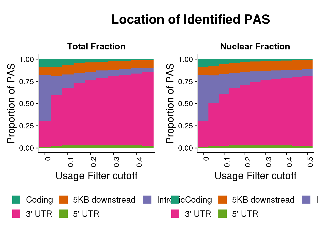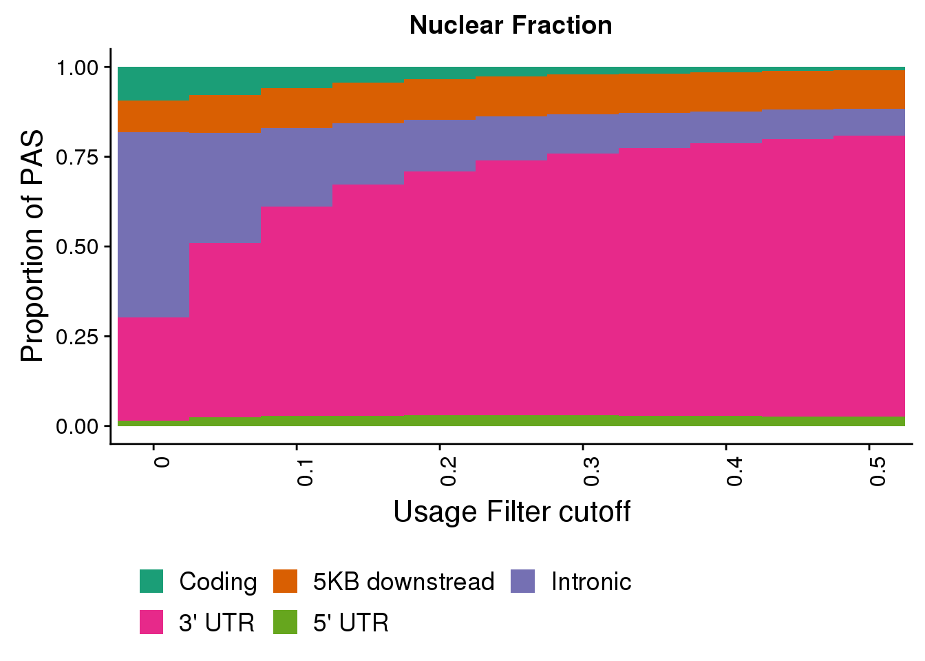 nucplotloc=ggplot(NucFullDF_locMelt,aes(x=Cutoff, y=propPAS, by=Location, fill=Location)) + geom_bar(width = 1, stat="identity") + labs(title="Nuclear Fraction",y="Proportion of PAS", x="Usage Filter cutoff")+ theme(axis.text.x = element_text(angle = 90, hjust = 1)) + scale_x_discrete(name="Usage Filter cutoff", breaks=c("0","0.1","0.2", "0.3", "0.4","0.5"))+ theme(text = element_text(size=16), legend.position = "bottom", legend.box="horizontal")+ scale_fill_brewer(name = "", labels = c("Coding", "5KB downstread", "Intronic", "3' UTR", "5' UTR"),palette="Dark2") + guides(fill=guide_legend(nrow=2,byrow=TRUE))