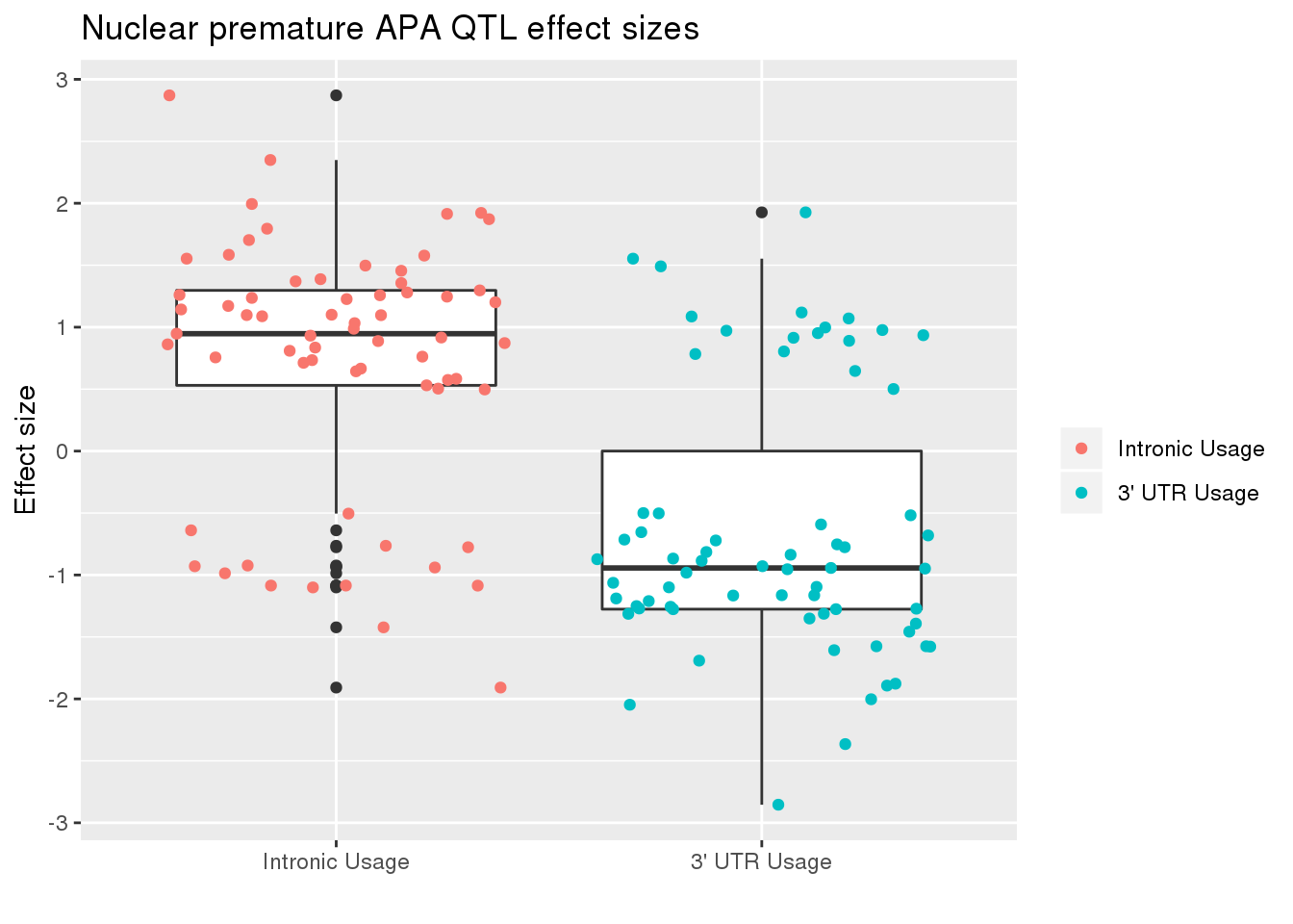 ggplot(nucRes_sig_dir, aes(x=Frac, y=slope)) + geom_boxplot() + geom_jitter(aes(col=Frac)) + labs(title="Nuclear premature APA QTL effect sizes", y="Effect size",x="") + scale_x_discrete(labels=c( "Intronic Usage","3' UTR Usage"))+ scale_color_discrete(name ="", labels=c( "Intronic Usage","3' UTR Usage"))