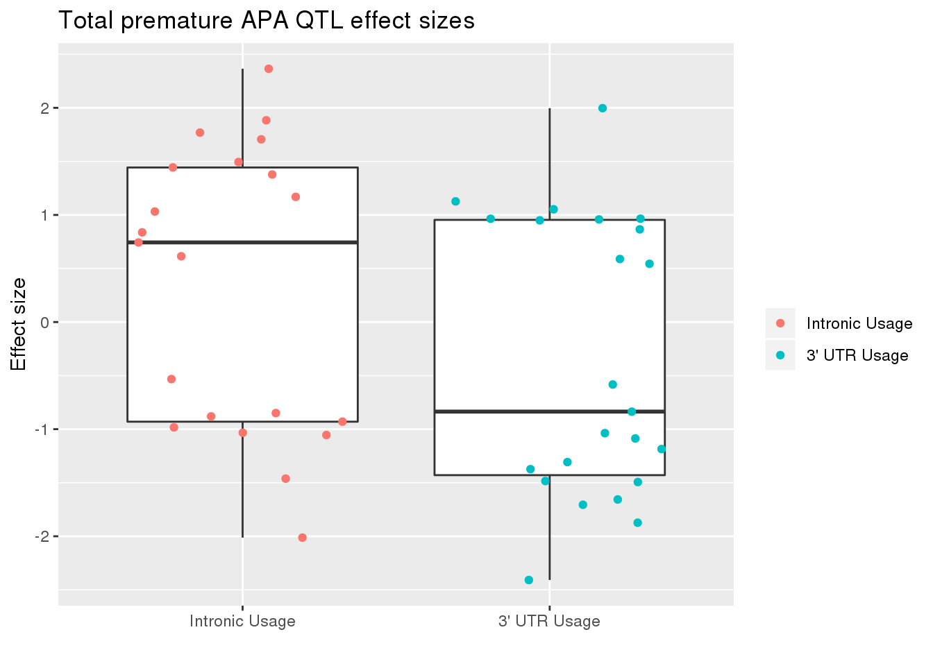 ggplot(totRes_sig_dir, aes(x=Frac, y=slope)) + geom_boxplot() + geom_jitter(aes(col=Frac))+ labs(title="Total premature APA QTL effect sizes", y="Effect size",x="") + scale_x_discrete(labels=c( "Intronic Usage","3' UTR Usage"))+ scale_color_discrete(name ="", labels=c( "Intronic Usage","3' UTR Usage"))