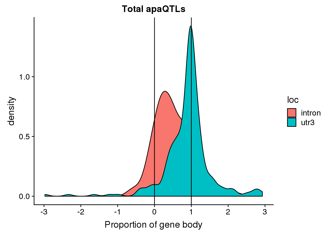 ggplot(totQTLs_gene_intron_utr, aes(x=propGene, fill=loc)) + geom_density() + labs(x="Proportion of gene body", title="Total apaQTLs") + geom_vline(xintercept =0,color= "black") + geom_vline(xintercept =1,color= "black")