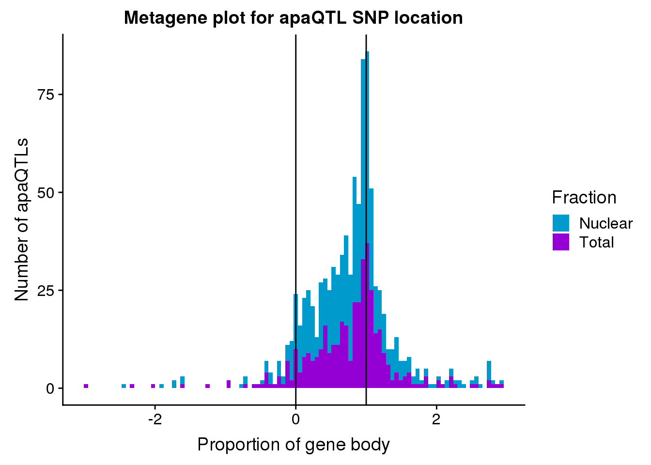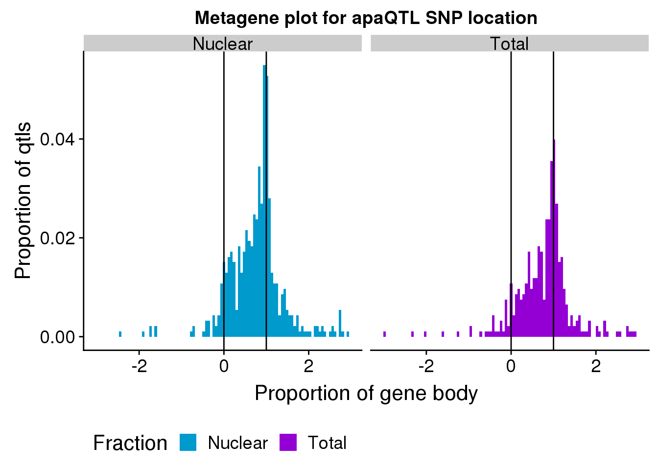 propgenebodyplot=ggplot(genepropboth, aes(x=propGene,fill=Fraction)) + geom_histogram(bins=100,aes(y = (..count..)/sum(..count..))) + geom_vline(xintercept =0,color= "black") + geom_vline(xintercept =1,color= "black")+ scale_fill_manual(values=c("deepskyblue3","darkviolet")) + labs(y="Proportion of qtls",x="Proportion of gene body", title="Metagene plot for apaQTL SNP location")+ theme(text = element_text(size=16),legend.position = "bottom", axis.text.x =element_text(size=14), axis.text.y=element_text(size=14)) + facet_grid(~Fraction)