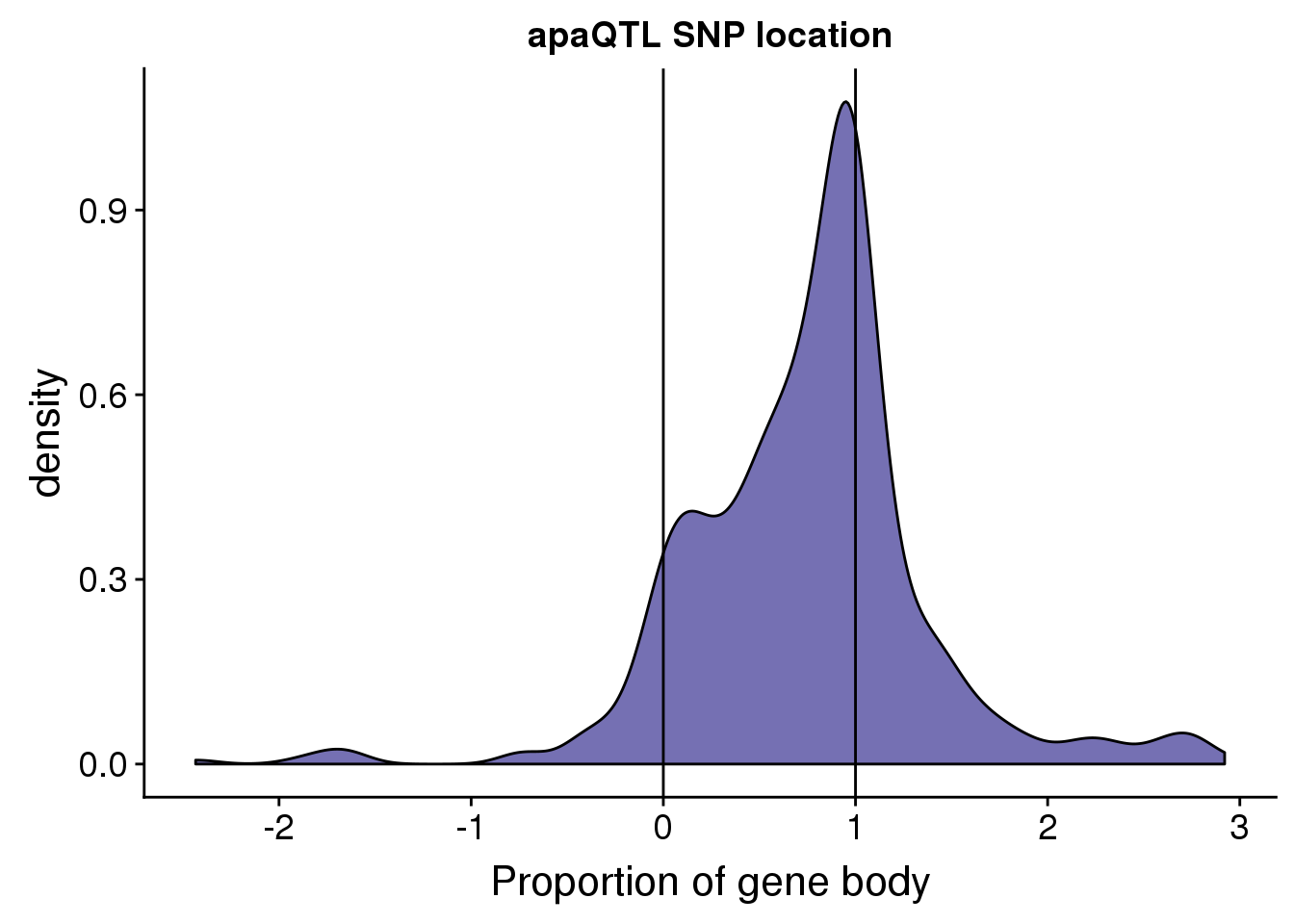 ggplot(geneprop_nuc, aes(x=propGene)) + geom_density(bins=100, fill="#7570B3") + geom_vline(xintercept =0,color= "black") + geom_vline(xintercept =1,color= "black") + labs(x="Proportion of gene body", title="apaQTL SNP location")+ theme(text = element_text(size=16), axis.text.x =element_text(size=14), axis.text.y=element_text(size=14))