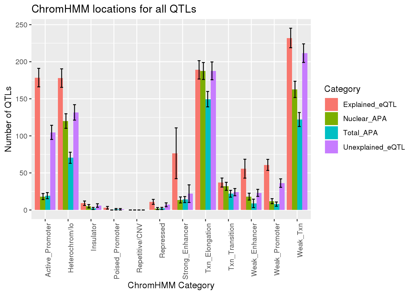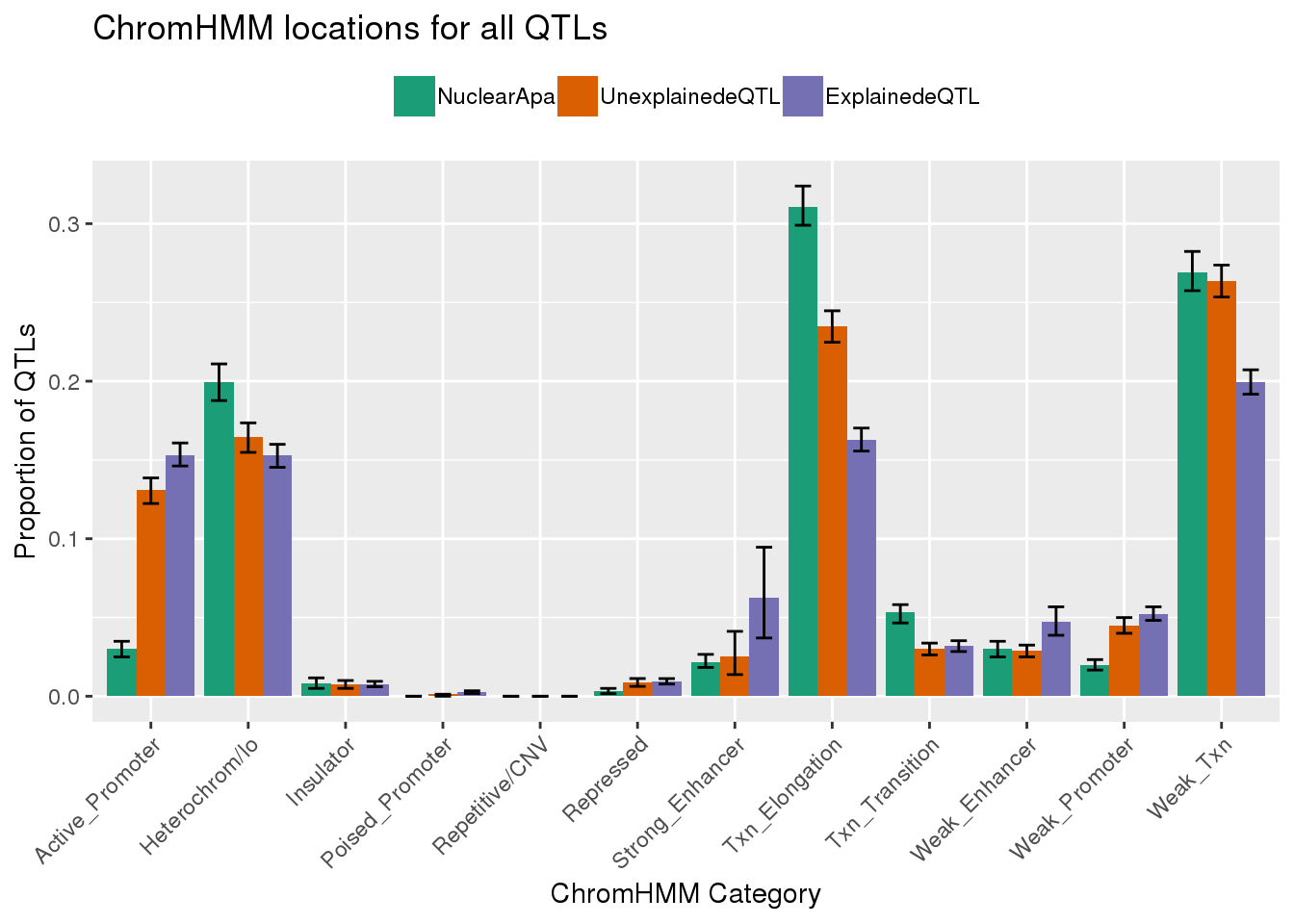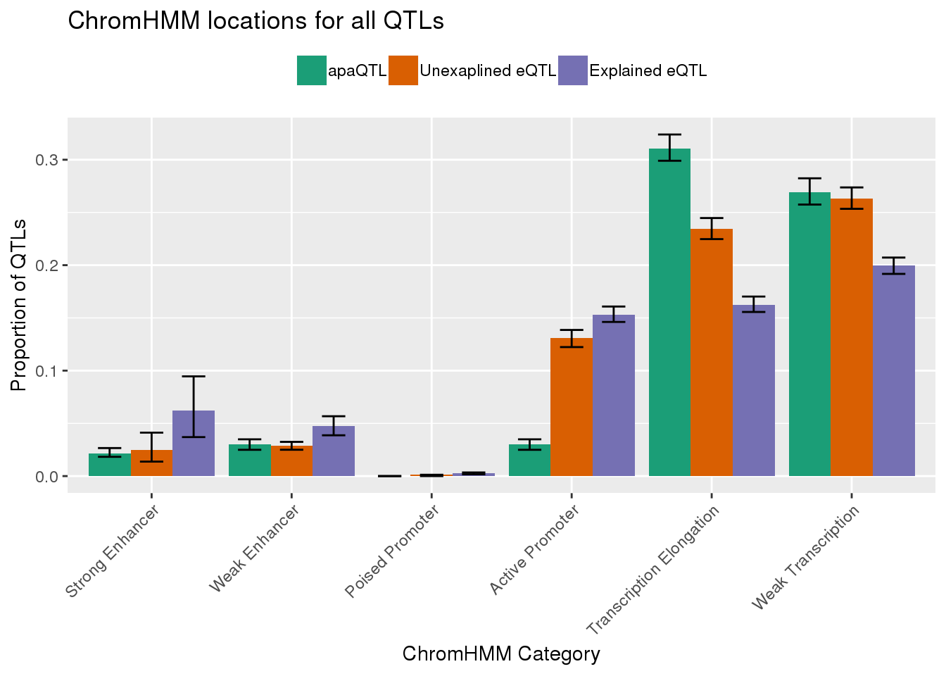 chromhmmplot=ggplot(AllQTLsProp95_certcat, aes(x=HMMname, y=fifty, fill=category)) + geom_bar(stat="identity", position="dodge")+ geom_errorbar(aes(ymin=twentyfive, ymax=seventyfive),width=.5, position = position_dodge(0.9)) + theme(axis.text.x=element_text(angle=45, hjust=1),legend.position = "top", legend.title = element_blank())+labs(y="Proportion of QTLs", x="ChromHMM Category", title="ChromHMM locations for all QTLs") + scale_fill_brewer(palette="Dark2",labels=c("apaQTL","Unexaplined eQTL", "Explained eQTL"))+scale_x_discrete(labels= c("Strong Enhancer", "Weak Enhancer", "Poised Promoter", "Active Promoter", "Transcription Elongation", "Weak Transcription"))