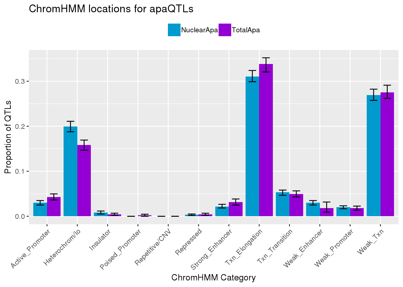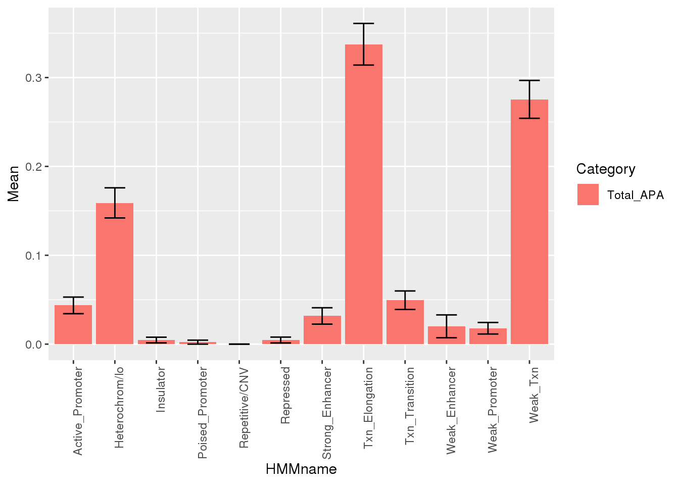 TotalResMProp=melt(TotalRes, id.vars="HMMcat") %>%inner_join(chromHmm, by="HMMcat") %>% mutate(nQTL= nrow(totQTLs), propQTL=value/nQTL)%>% group_by(HMMname) %>% summarise(Mean=mean(propQTL), SD=sd(propQTL)) %>% mutate(Category="Total_APA")