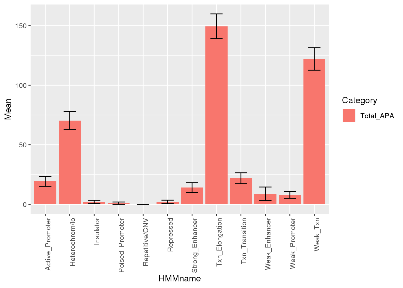 TotalResM=melt(TotalRes, id.vars="HMMcat") %>%inner_join(chromHmm, by="HMMcat") %>% group_by(HMMname) %>% summarise(Mean=mean(value), SD=sd(value)) %>% mutate(Category="Total_APA")