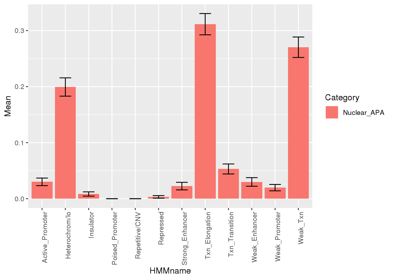 NuclearResM=melt(NuclearRes, id.vars="HMMcat") %>%inner_join(chromHmm, by="HMMcat") %>% group_by(HMMname) %>% summarise(Mean=mean(value), SD=sd(value)) %>% mutate(Category="Nuclear_APA")