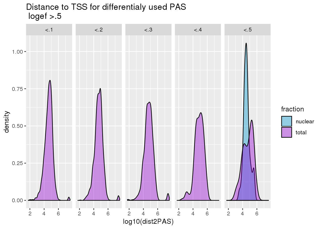 effectsize_TSS= effectsize %>% separate(intron, into=c("chrom", "start", "end", "gene"),sep=":") %>% mutate(fraction=ifelse(deltaPAU < 0, "nuclear", "total")) %>% inner_join(tss, by="gene") %>% mutate(dist2PAS=ifelse(strand=="+", as.numeric(end)-as.numeric(TSS), as.numeric(TSS)-as.numeric(start)))