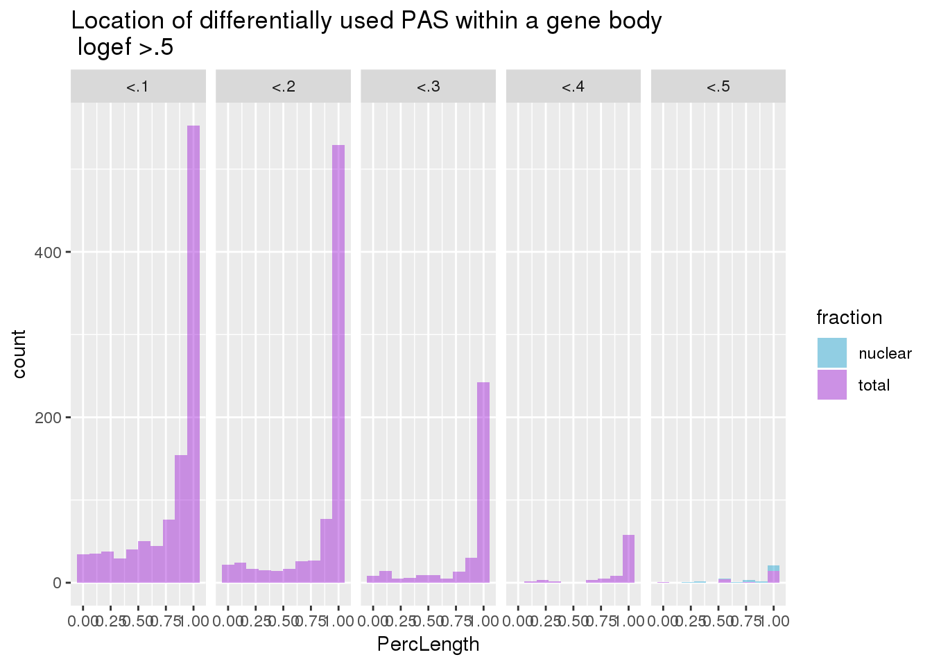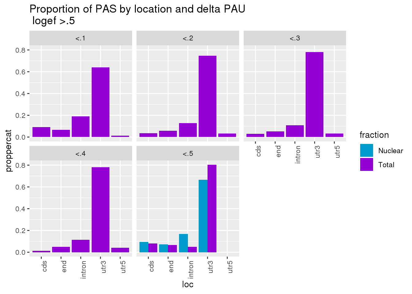 Total_dpau= effectsize %>% filter(deltaPAU > 0) %>% inner_join(PAS, by="intron") %>% select(-logef, -Nuclear,-Total) %>% mutate(fraction="Total", PAU_Cat=ifelse(deltaPAU <.1, "<.1", ifelse(deltaPAU >=.1 & deltaPAU <.2, "<.2", ifelse(deltaPAU >=.2 & deltaPAU <.3, "<.3", ifelse(deltaPAU >=.3 & deltaPAU <.4, "<.4", "<.5")))))