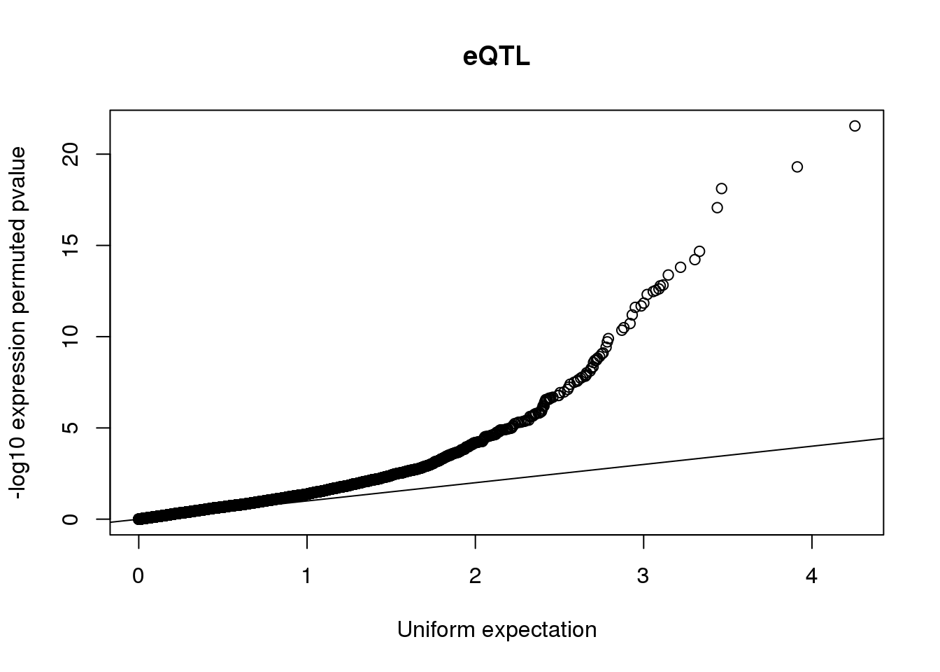 qqplot(-log10(runif(nrow(permeqtl_notnucSpec))), -log10(permeqtl_notnucSpec$bpval),ylab="-log10 expression permuted pvalue", xlab="Uniform expectation", main="eQTL")