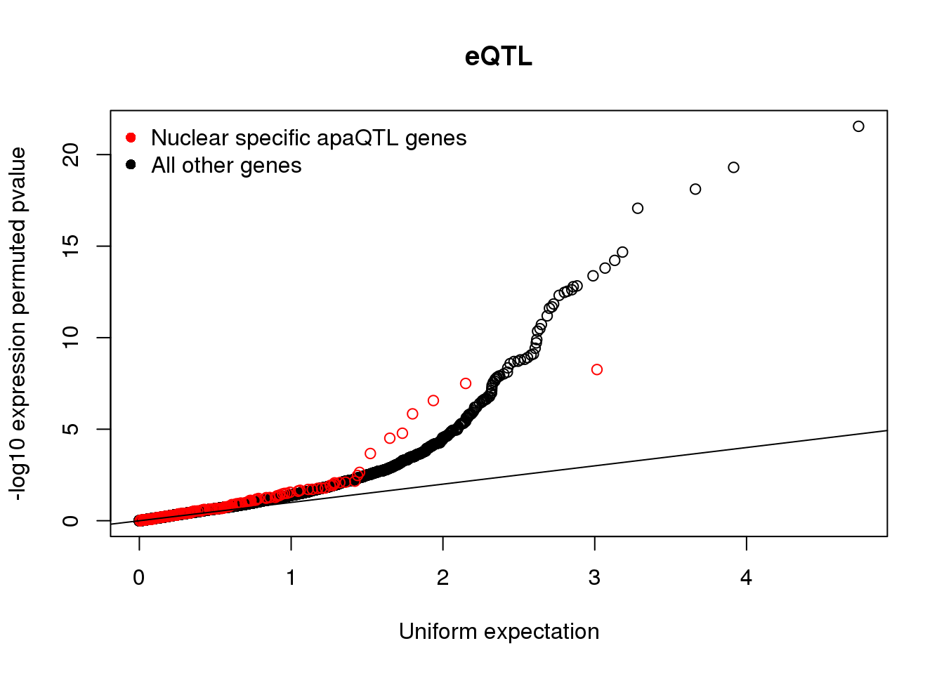 legend("topleft", legend=c("Nuclear specific apaQTL genes", "All other genes"),col=c("red", "black"), pch=16,bty = 'n')