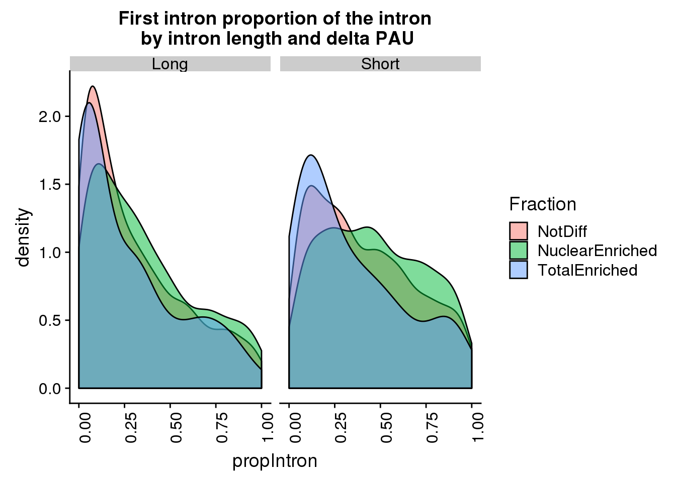 ggplot(pas2intronTotal_cat_first, aes(x=propIntron, by=Fraction, fill=Fraction)) + geom_density(alpha=.5) + facet_grid(~LengthHalf)  + theme(axis.text.x = element_text(angle = 90, hjust = 1)) + labs(title="First intron proportion of the intron\n by intron length and delta PAU")