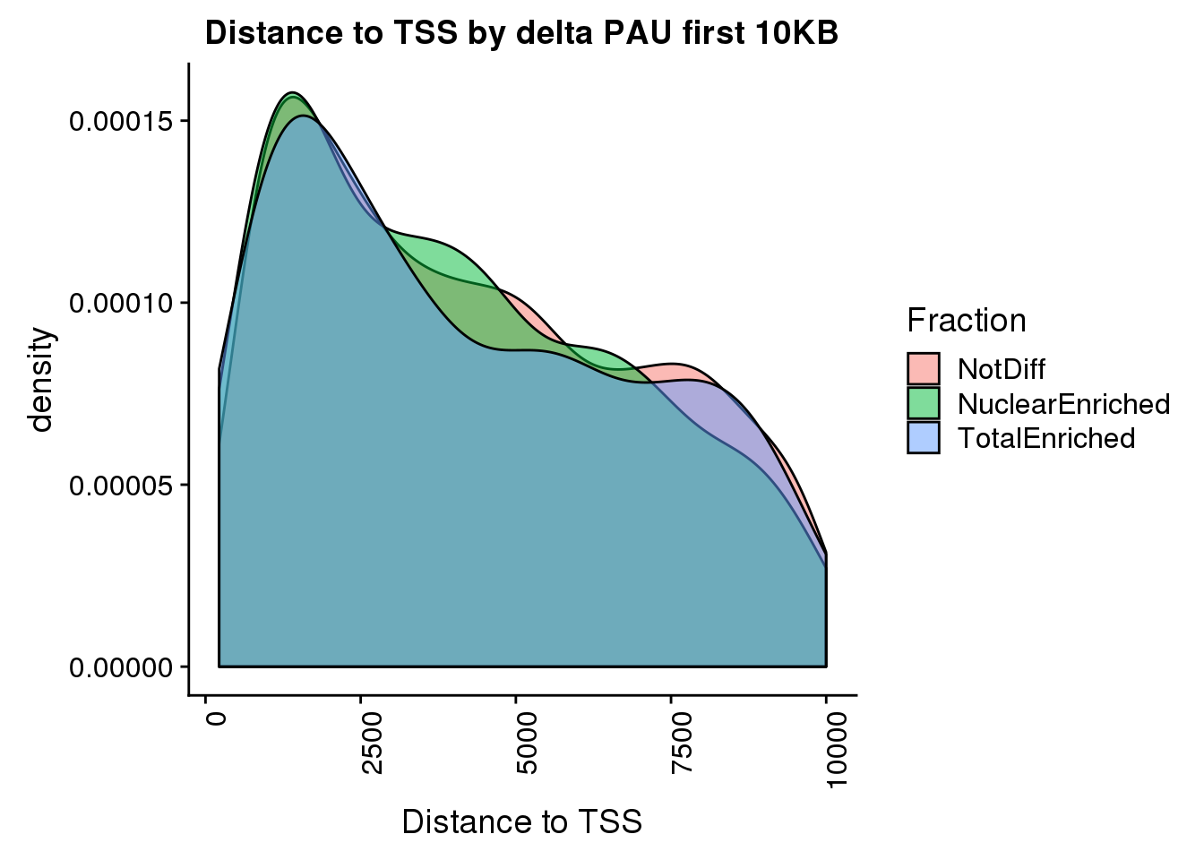 ggplot(pas2intronTotal_catTSS, aes(x=dist2TSS, by=Fraction, fill=Fraction)) + geom_density(alpha=.5) + labs(title="Distance to TSS by delta PAU first 10KB", x="Distance to TSS")+  theme(axis.text.x = element_text(angle = 90, hjust = 1))