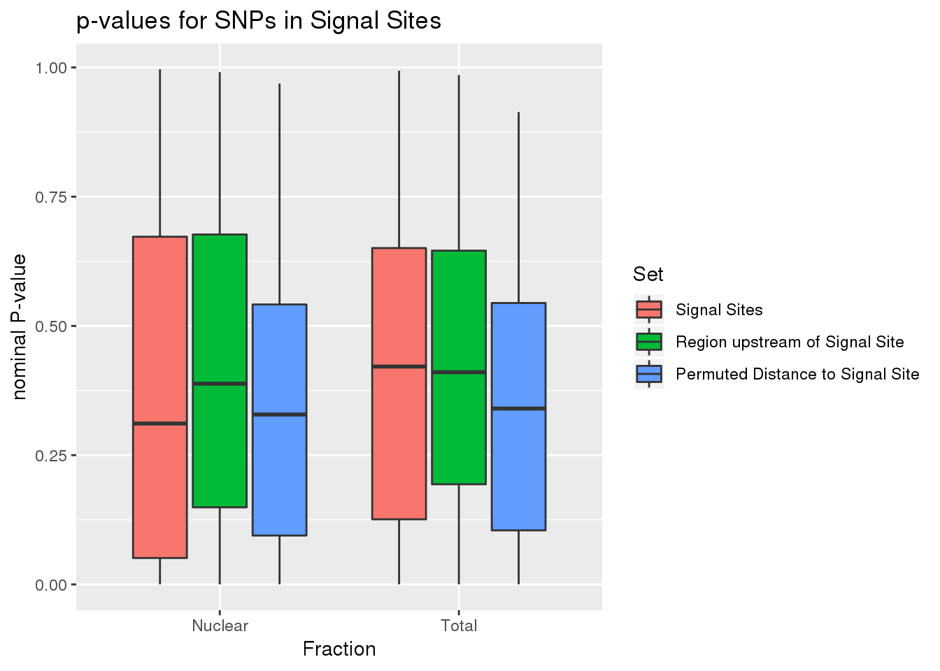 ggplot(all_SS_pval, aes(x=fraction, fill=set, y=pval)) + geom_boxplot() + labs(x="Fraction", title="p-values for SNPs in Signal Sites",y="nominal P-value" ) + scale_fill_discrete(name = 'Set', labels = c('Signal Sites', 'Region upstream of Signal Site', 'Permuted Distance to Signal Site',"50 bp upstream of PAS"))