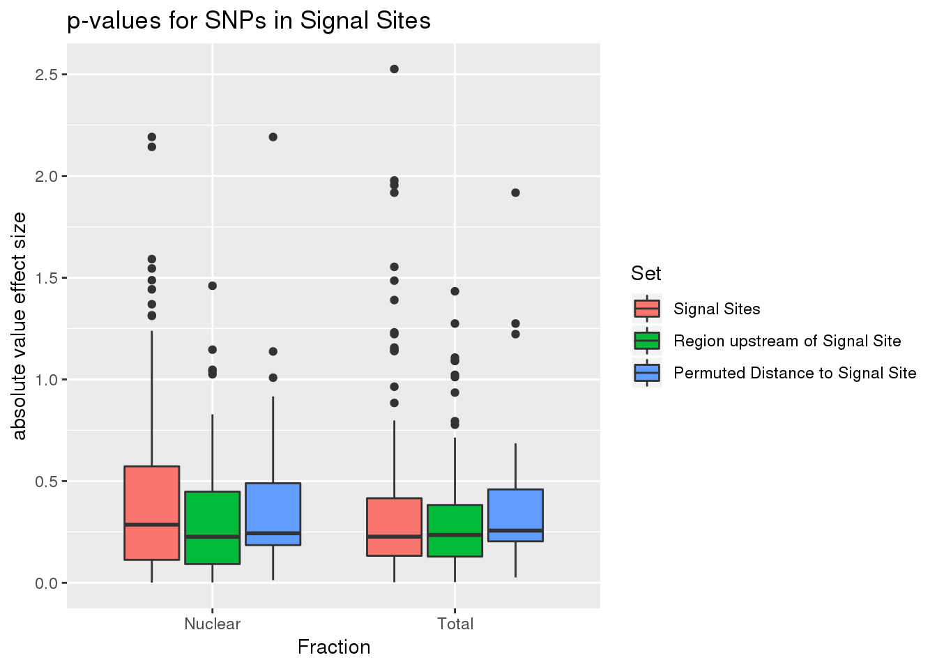 ggplot(all_SS_pval, aes(x=fraction, fill=set, y=abs(slope))) + geom_boxplot() + labs(x="Fraction", title="p-values for SNPs in Signal Sites",y="absolute value effect size" ) + scale_fill_discrete(name = 'Set', labels = c('Signal Sites', 'Region upstream of Signal Site', 'Permuted Distance to Signal Site',"50 bp upstream of PAS"))