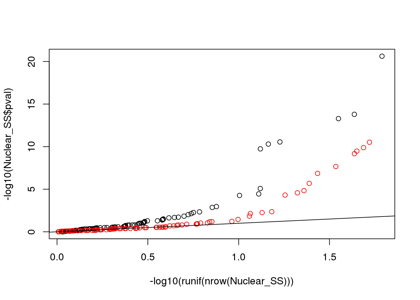 points(sort(-log10(runif(nrow(Nuclear_SS)))), sort(-log10(Nuclear_SS$pval)),col= alpha("Red"))