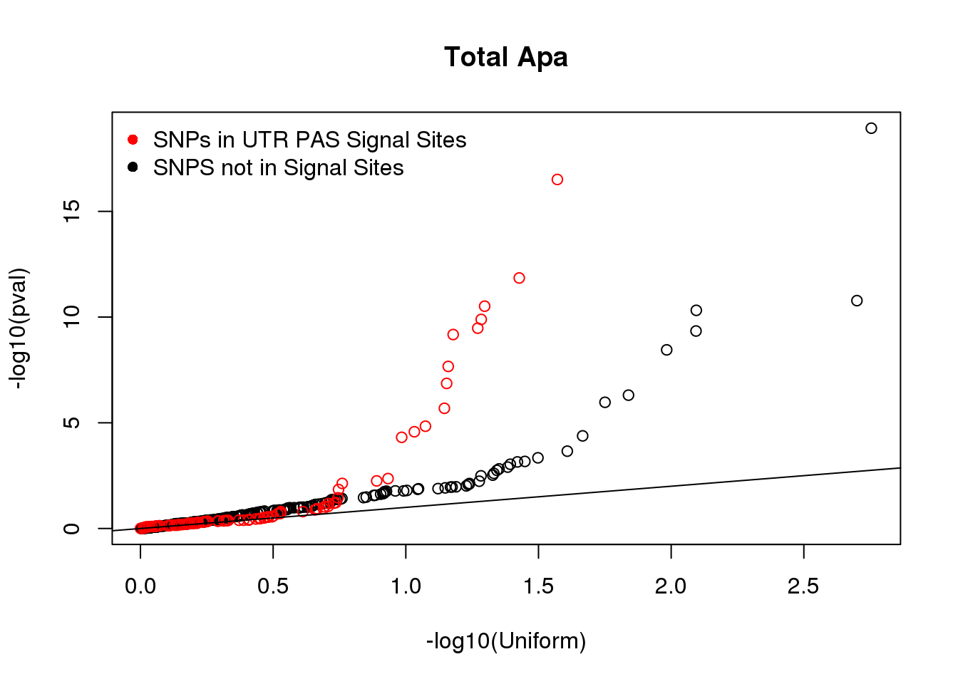 qqplot(-log10(runif(nrow(Total_NOSS))), -log10(Total_NOSS$pval), xlab="-log10(Uniform)", ylab="-log10(pval)", main="Total Apa")