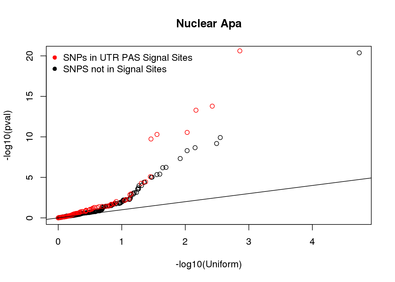 legend("topleft", legend=c("SNPs in UTR PAS Signal Sites", "SNPS not in Signal Sites"),col=c("red", "black"), pch=16,bty = 'n')