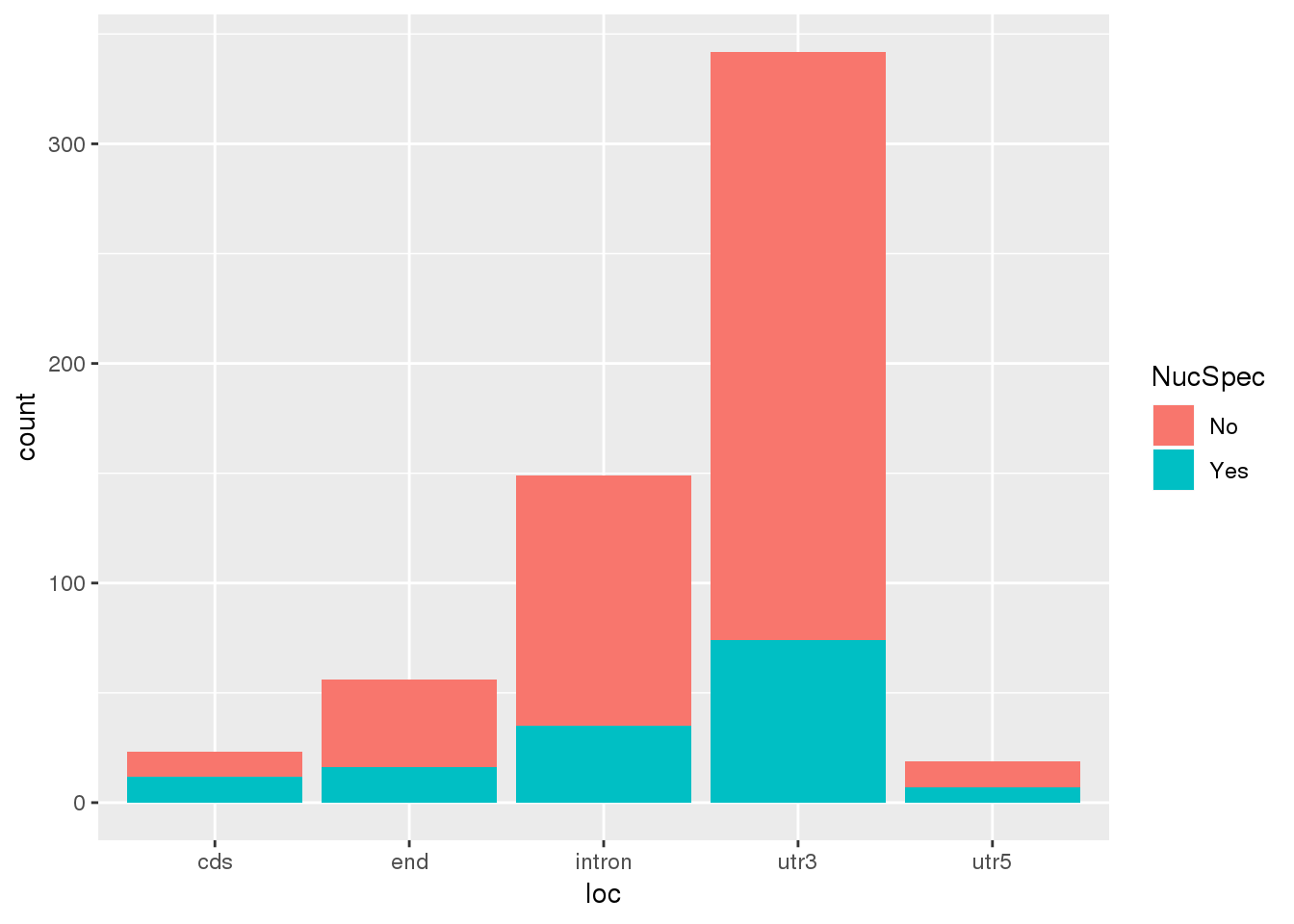 ggplot(nucAPAinTot_withsig, aes(x=loc, fill=NucSpec)) + geom_bar()