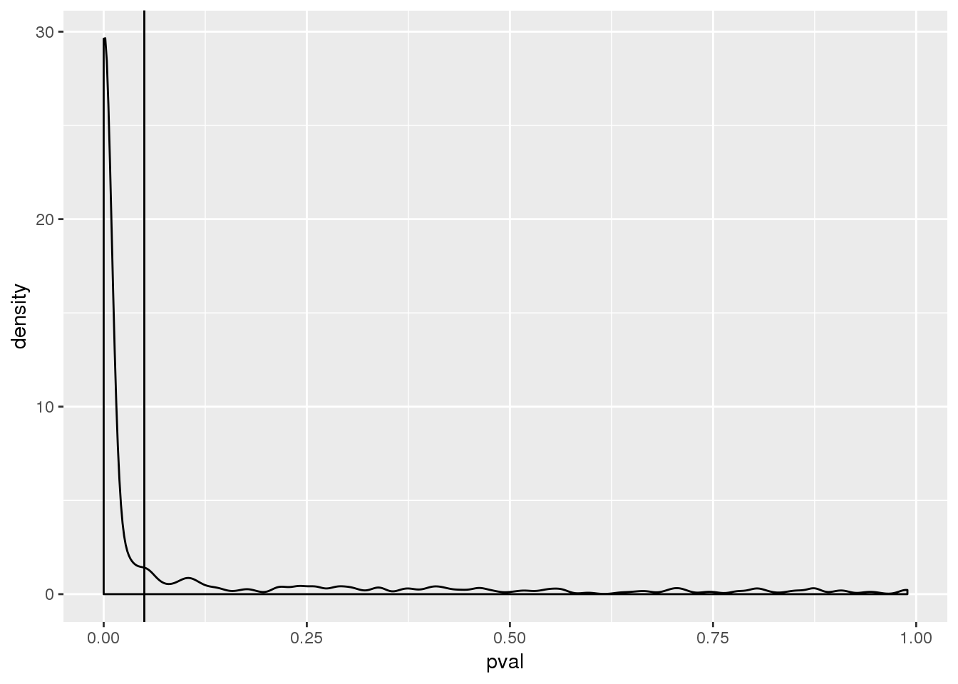 ggplot(nucAPAinTot, aes(x=pval)) + geom_density() + geom_vline(xintercept = .05)