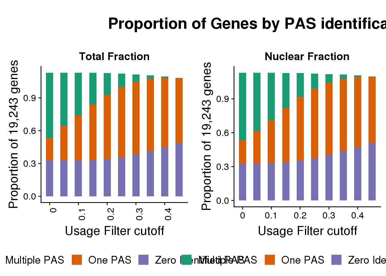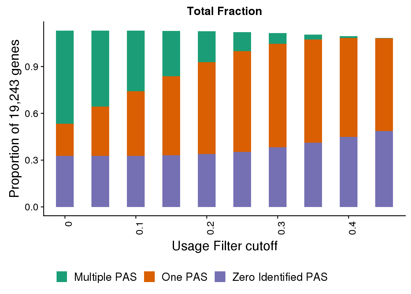 totalPropgenes=ggplot(fullDF_melt,aes(x=Cutoff, y=propGene, by=Category, fill=Category)) + geom_bar(width=.5, stat="identity") + labs(title="Total Fraction", y="Proportion of 19,243 genes", x="Usage Filter cutoff") + theme(axis.text.x = element_text(angle = 90, hjust =1)) + scale_x_discrete(name="Usage Filter cutoff", breaks=c("0","0.1","0.2", "0.3", "0.4","0.5"))+ theme(text = element_text(size=16),legend.position = "bottom")+scale_fill_brewer(name = "", labels = c("Multiple PAS", "One PAS", "Zero Identified PAS"),palette="Dark2")