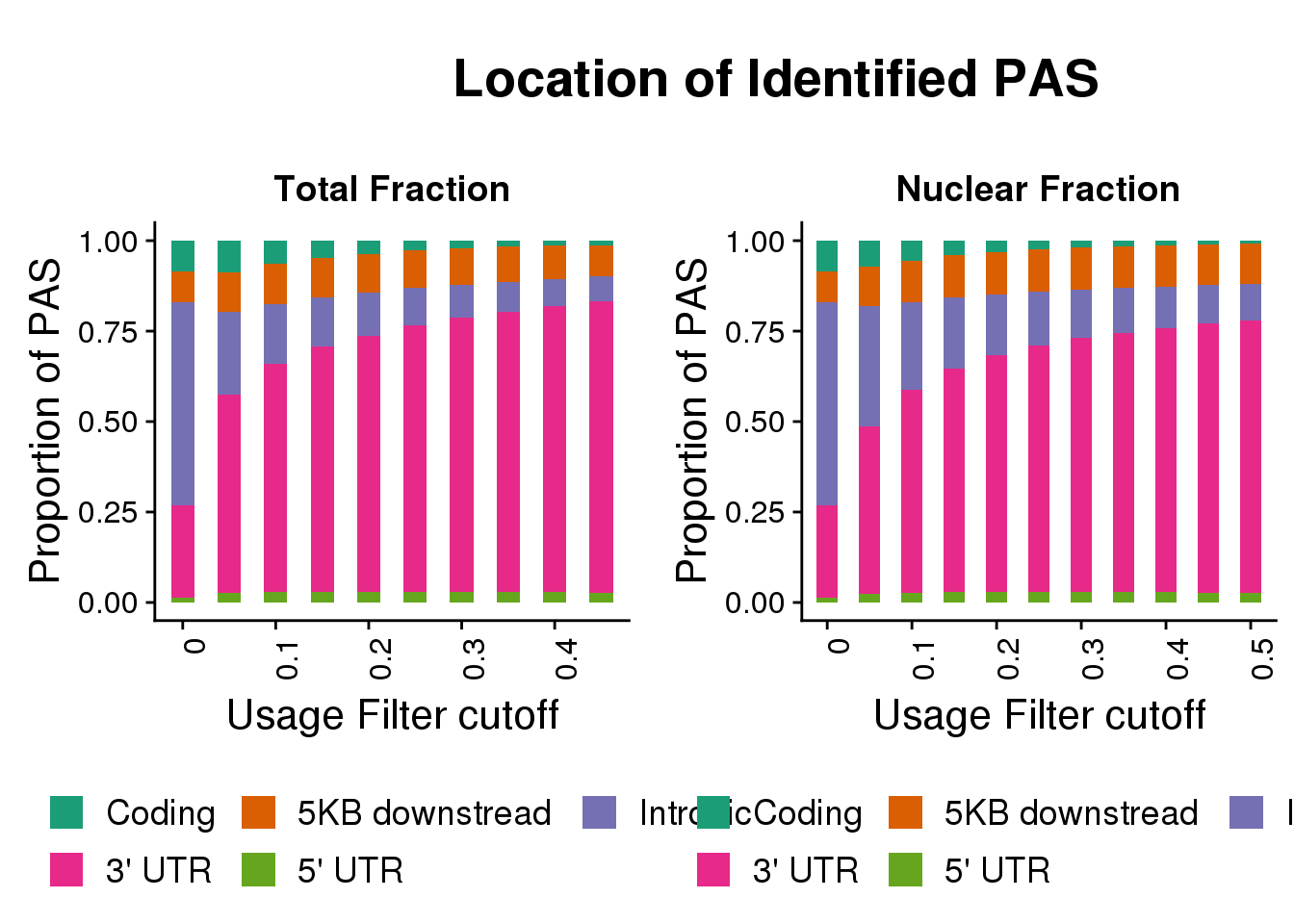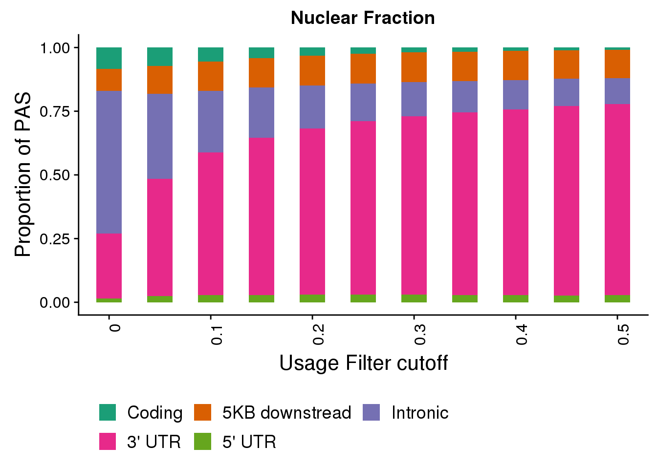 nucplotloc=ggplot(NucFullDF_locMelt,aes(x=Cutoff, y=propPAS, by=Location, fill=Location)) + geom_bar(width = .5, stat="identity") + labs(title="Nuclear Fraction",y="Proportion of PAS", x="Usage Filter cutoff")+ theme(axis.text.x = element_text(angle = 90, hjust = 1)) + scale_x_discrete(name="Usage Filter cutoff", breaks=c("0","0.1","0.2", "0.3", "0.4","0.5"))+ theme(text = element_text(size=16), legend.position = "bottom")+ scale_fill_brewer(name = "", labels = c("Coding", "5KB downstread", "Intronic", "3' UTR", "5' UTR"),palette="Dark2") + guides(fill=guide_legend(nrow=2,byrow=TRUE))