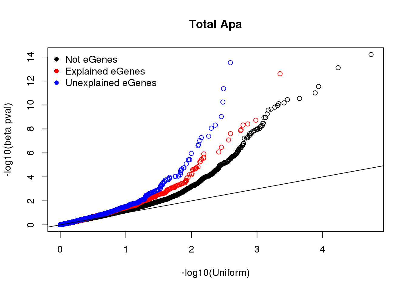 qqplot(-log10(runif(nrow(tot.notE))), -log10(tot.notE$bpval), xlab="-log10(Uniform)", ylab="-log10(beta pval)", main="Total Apa")