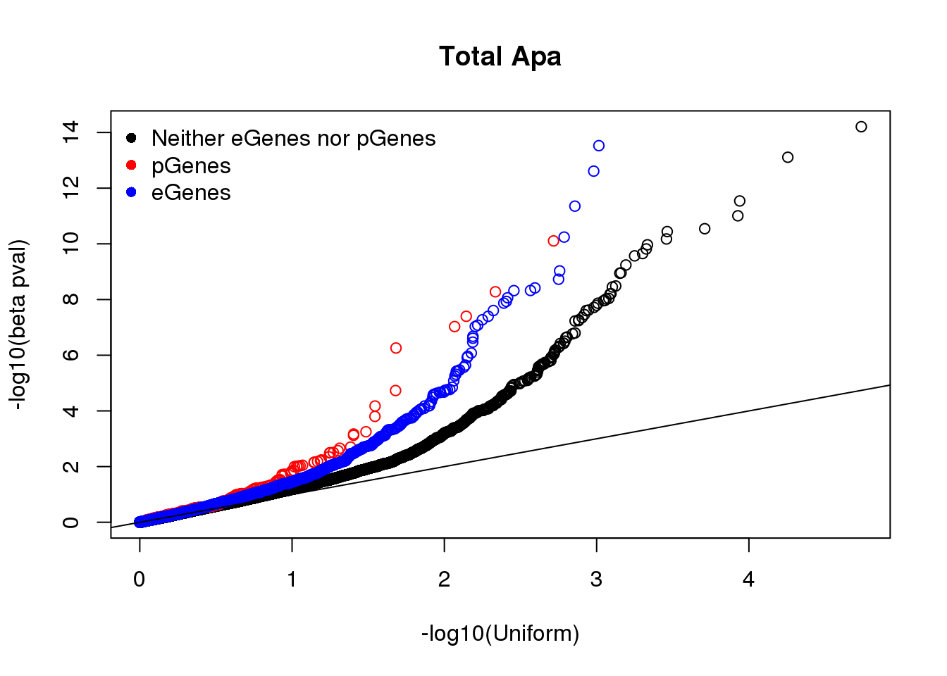 qqplot(-log10(runif(nrow(tot.notEorP))), -log10(tot.notEorP$bpval), xlab="-log10(Uniform)", ylab="-log10(beta pval)", main="Total Apa")