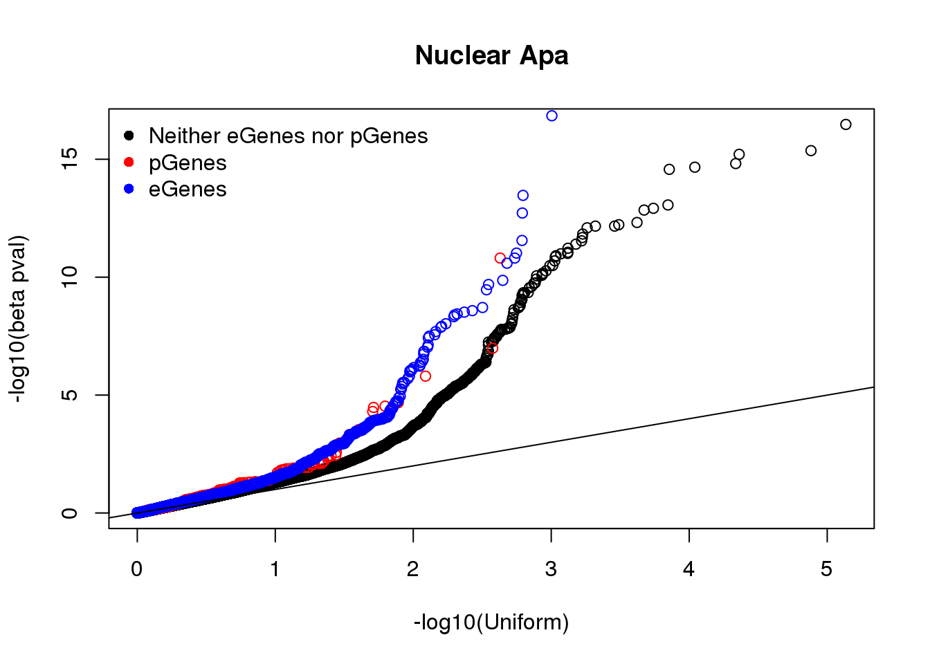 qqplot(-log10(runif(nrow(nuc.notEorP))), -log10(nuc.notEorP$bpval), xlab="-log10(Uniform)", ylab="-log10(beta pval)", main="Nuclear Apa")