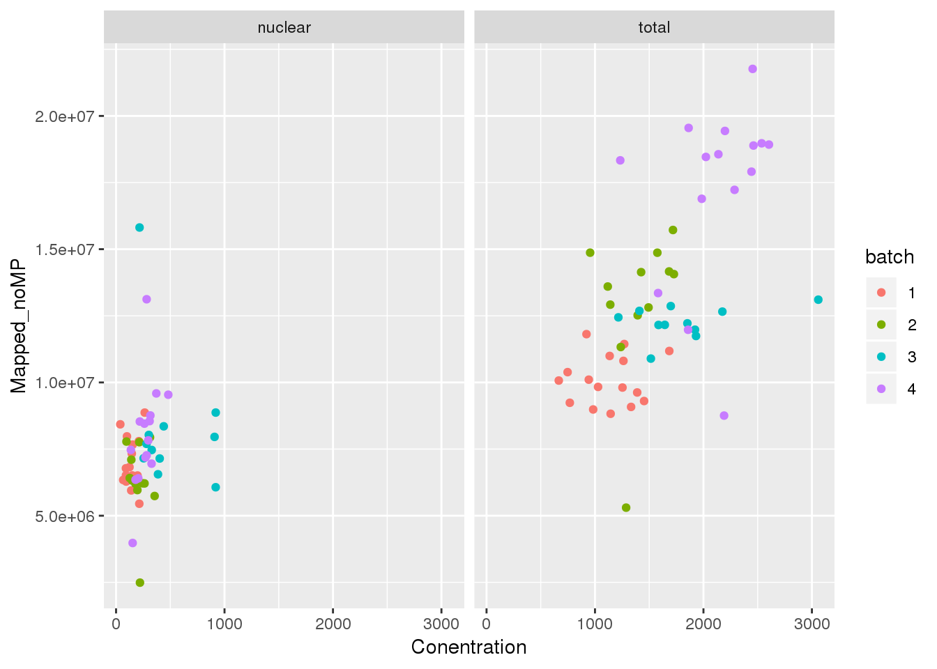 ggplot(metadata, aes(y=Mapped_noMP, col=batch, x=Conentration)) + geom_point() + facet_grid(~fraction)