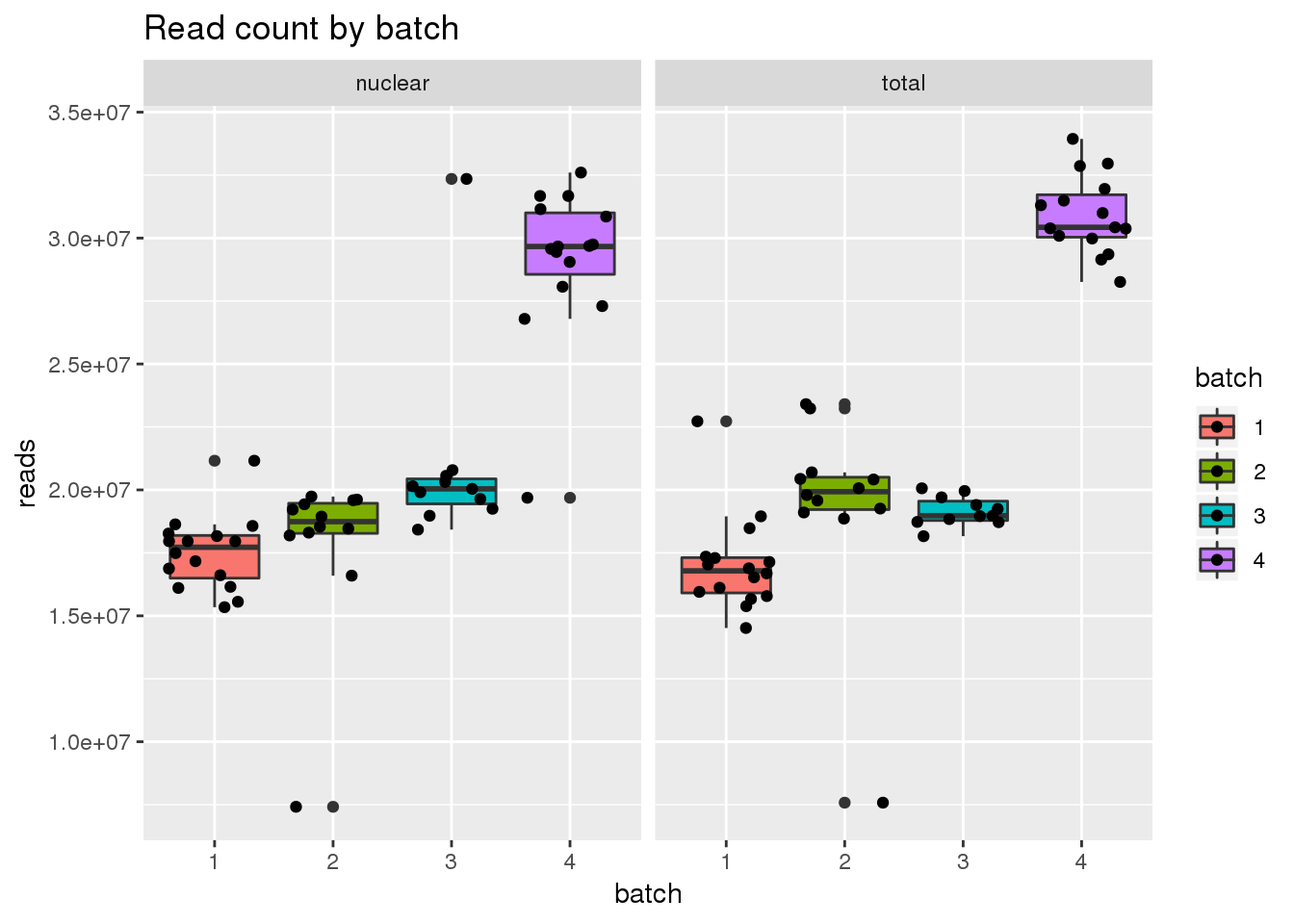 ggplot(metadata, aes(x=batch, group=batch, y=reads, fill=batch)) + geom_boxplot() + geom_jitter() + facet_grid(~fraction) + labs(title="Read count by batch")