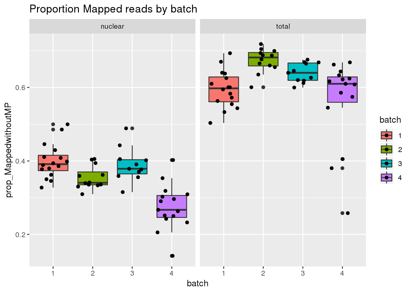 ggplot(metadata, aes(x=batch, group=batch, y=prop_MappedwithoutMP, fill=batch)) + geom_boxplot() + geom_jitter() + facet_grid(~fraction) + labs(title="Proportion Mapped reads by batch")