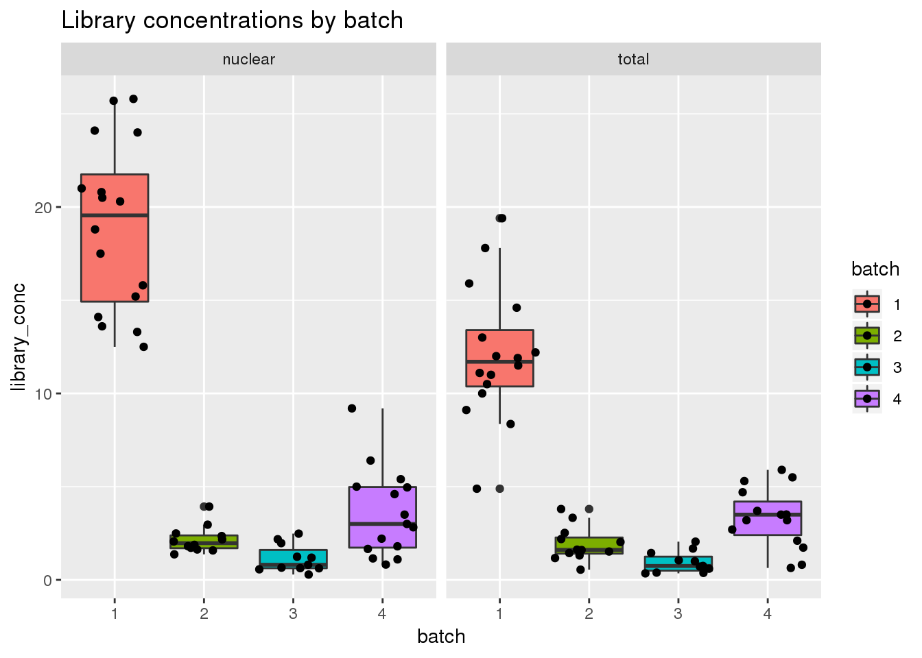 ggplot(metadata, aes(x=batch, group=batch, y=library_conc, fill=batch)) + geom_boxplot() + geom_jitter() + facet_grid(~fraction) + labs(title="Library concentrations by batch")