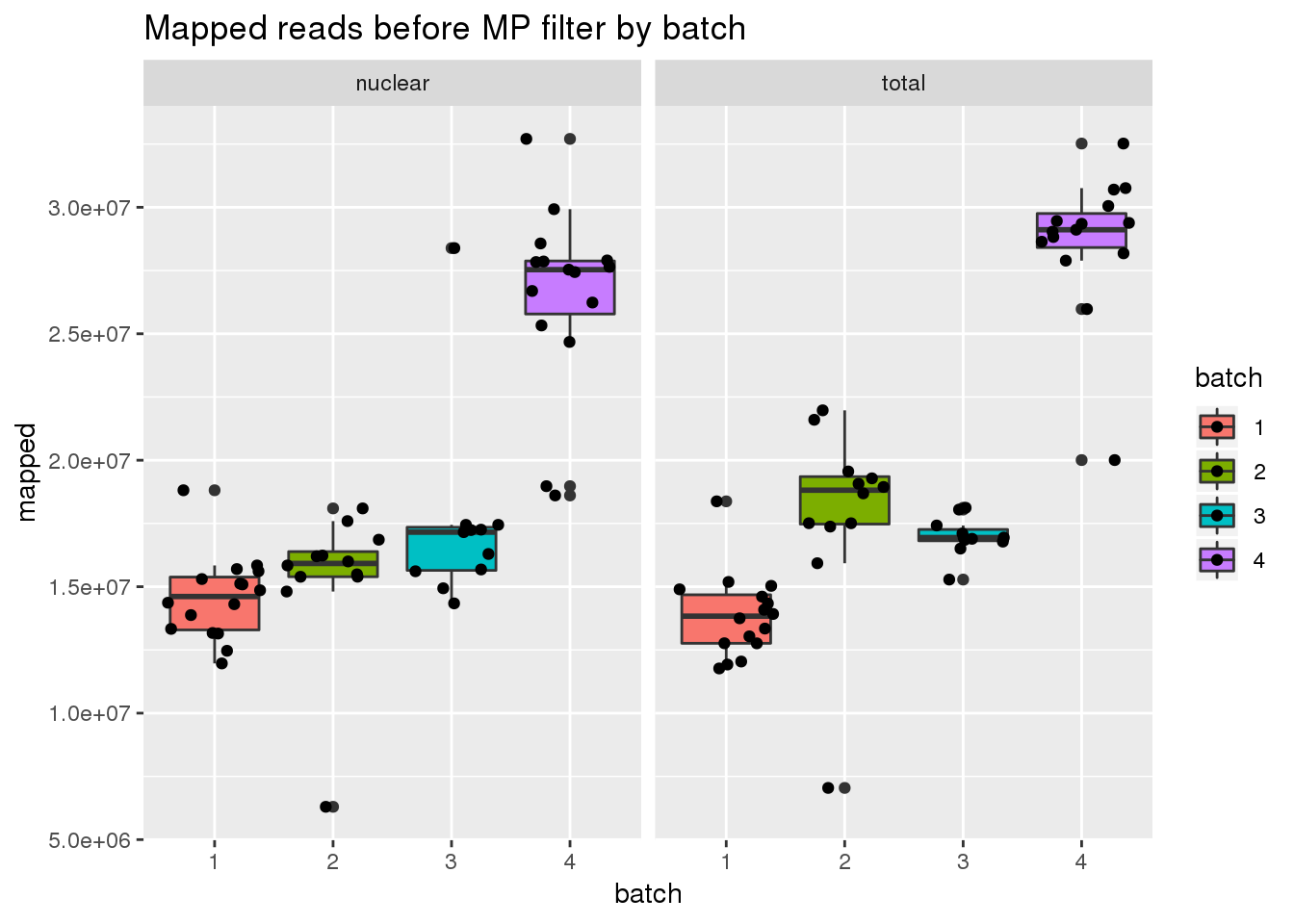 ggplot(metadata, aes(x=batch, group=batch, y=mapped, fill=batch)) + geom_boxplot() + geom_jitter() + facet_grid(~fraction) + labs(title="Mapped reads before MP filter by batch")