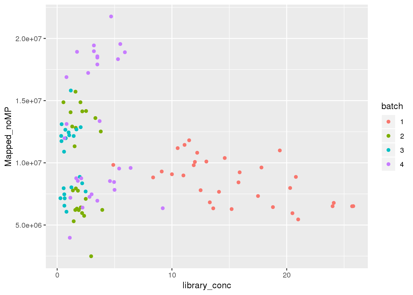 ggplot(metadata, aes(y=Mapped_noMP, col=batch, x=library_conc)) + geom_point()