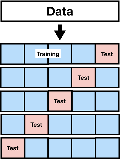 4. Switch which fold is your test data and repeat steps 2 and 3 until all folds have been test data (k times)