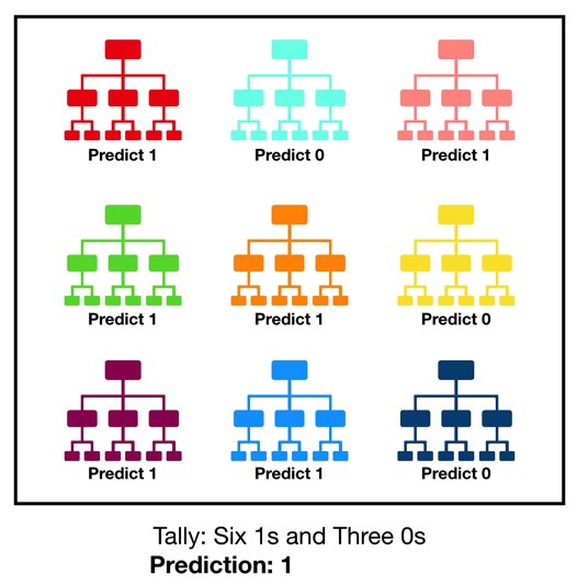 In practice, we don't typically predict with a single tree. Instead, we combine multiple trees and take the average/most common of their predictions. Keeping with the tree metaphor, this is referred to as the **random forest** algorithm.