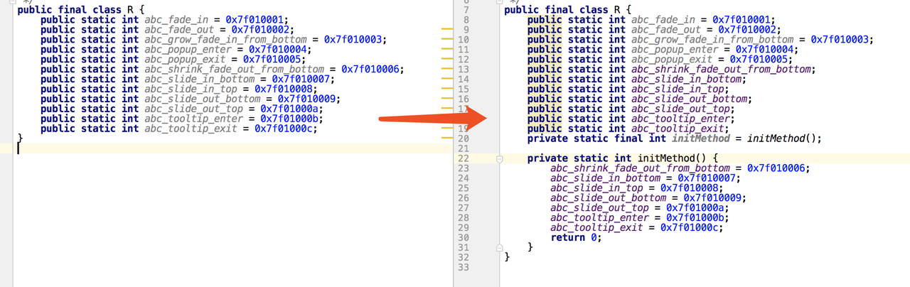 In addition, if it is R in the application module, the fields in R will be `public static final int xxx = yyy;`, under this condition, xxx is a constant field, and there is no initialized assignment instructions. The field's assignment is completed by the field's attributes. A `public static final int xxx = yyy` occupied by the constant pool size is 2: